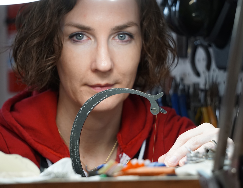 Faris is drawn to "the simplest techniques of sawing/piercing and fabrication as I find that I am able to forget about the process." Her work, she says, "explores the notion of advantage and disadvantage that, adjacently, resides within all beings."